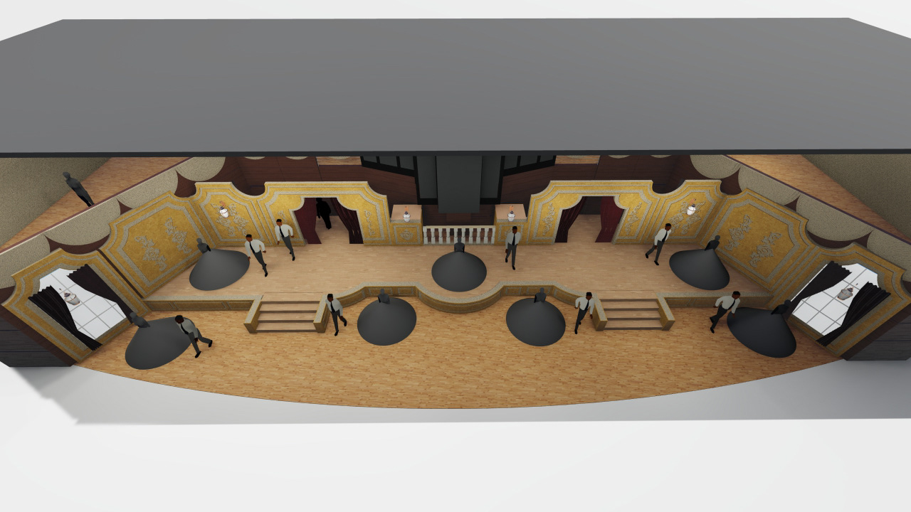 Set within the musical performance hall, this Society of Martha Washington Colonial Ball design evoked the opulent spirit of a grand opera house. The stage, framed in bold red drapery and patterned wallpaper, recalled the elegance of Met-style orchestra boxes — intimate yet theatrical. Crystal chandeliers and golden detailing elevated the sense of ceremony, transforming the space into a lavish tableau of music, movement, and history. The result was both regal and immersive — a celebration that blurred the line between performance and pageantry.
