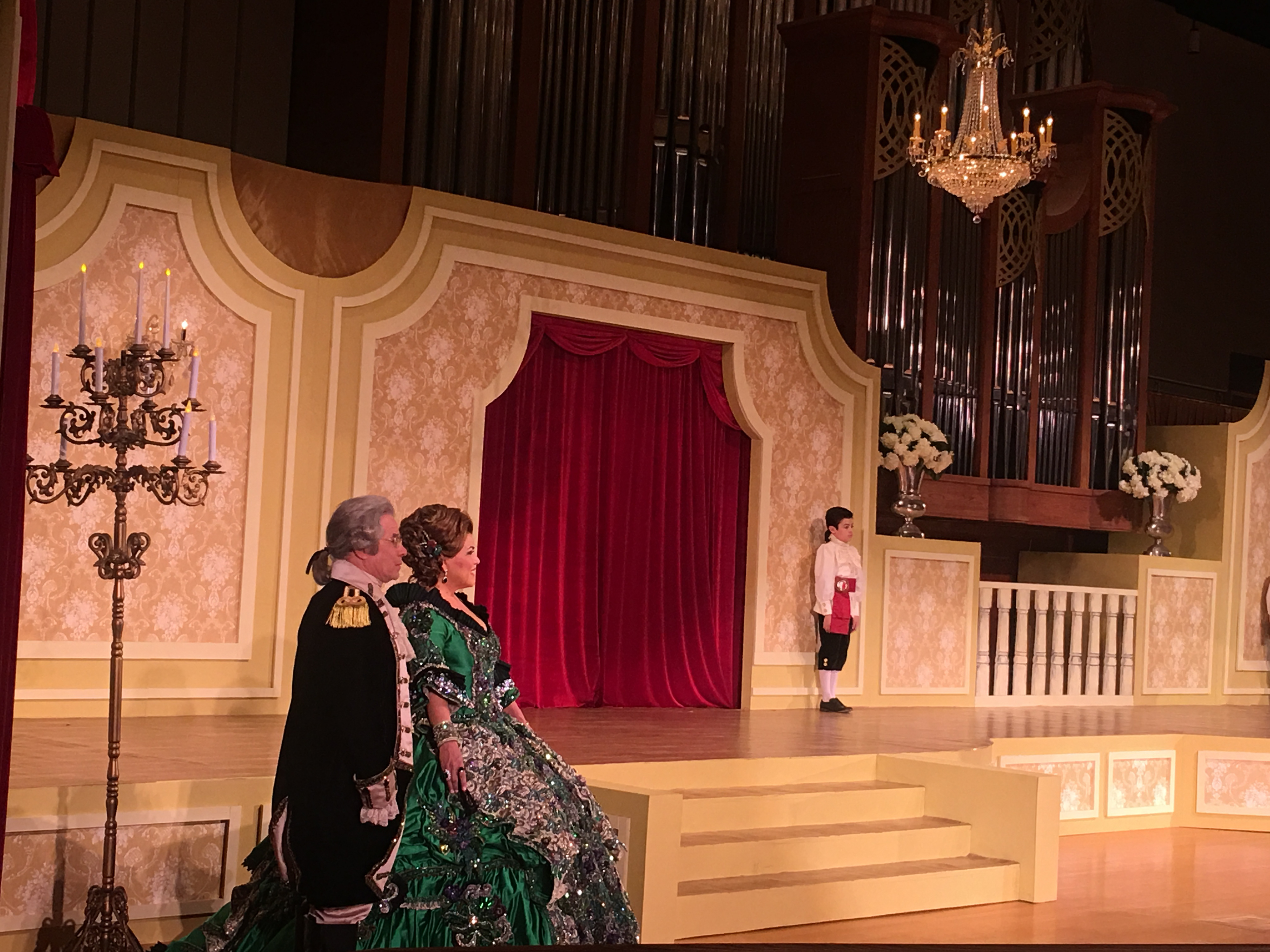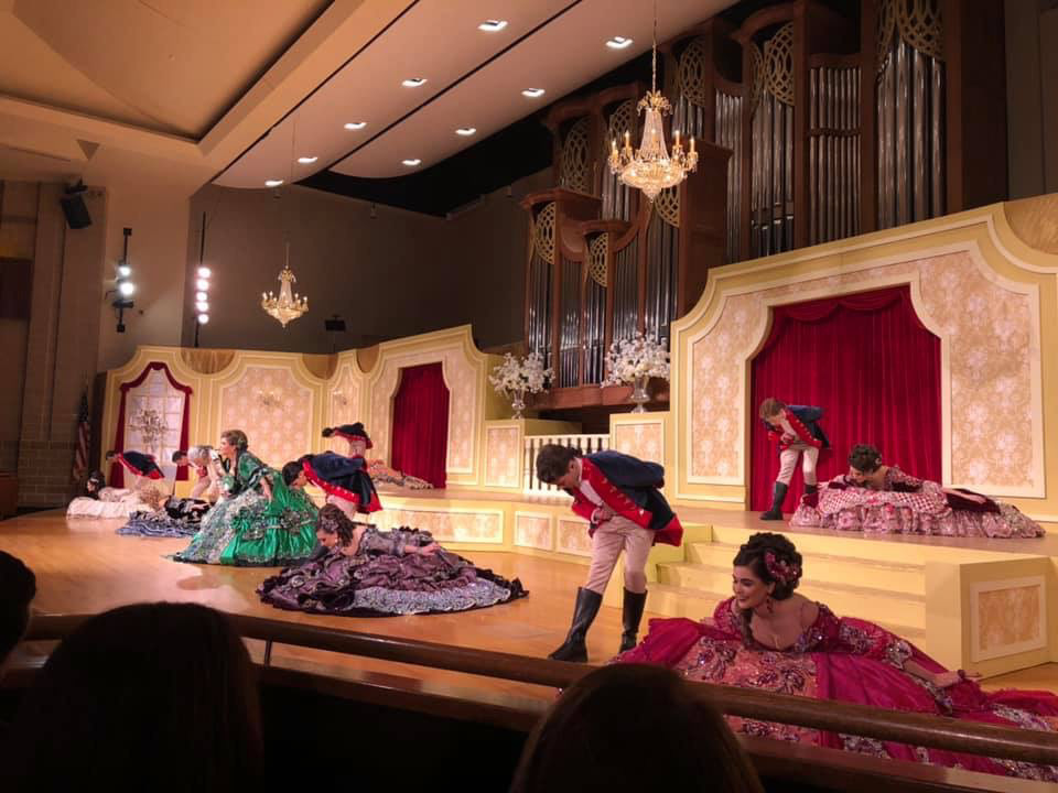 Set within the musical performance hall, this Society of Martha Washington Colonial Ball design evoked the opulent spirit of a grand opera house. The stage, framed in bold red drapery and patterned wallpaper, recalled the elegance of Met-style orchestra boxes — intimate yet theatrical. Crystal chandeliers and golden detailing elevated the sense of ceremony, transforming the space into a lavish tableau of music, movement, and history. The result was both regal and immersive — a celebration that blurred the line between performance and pageantry.