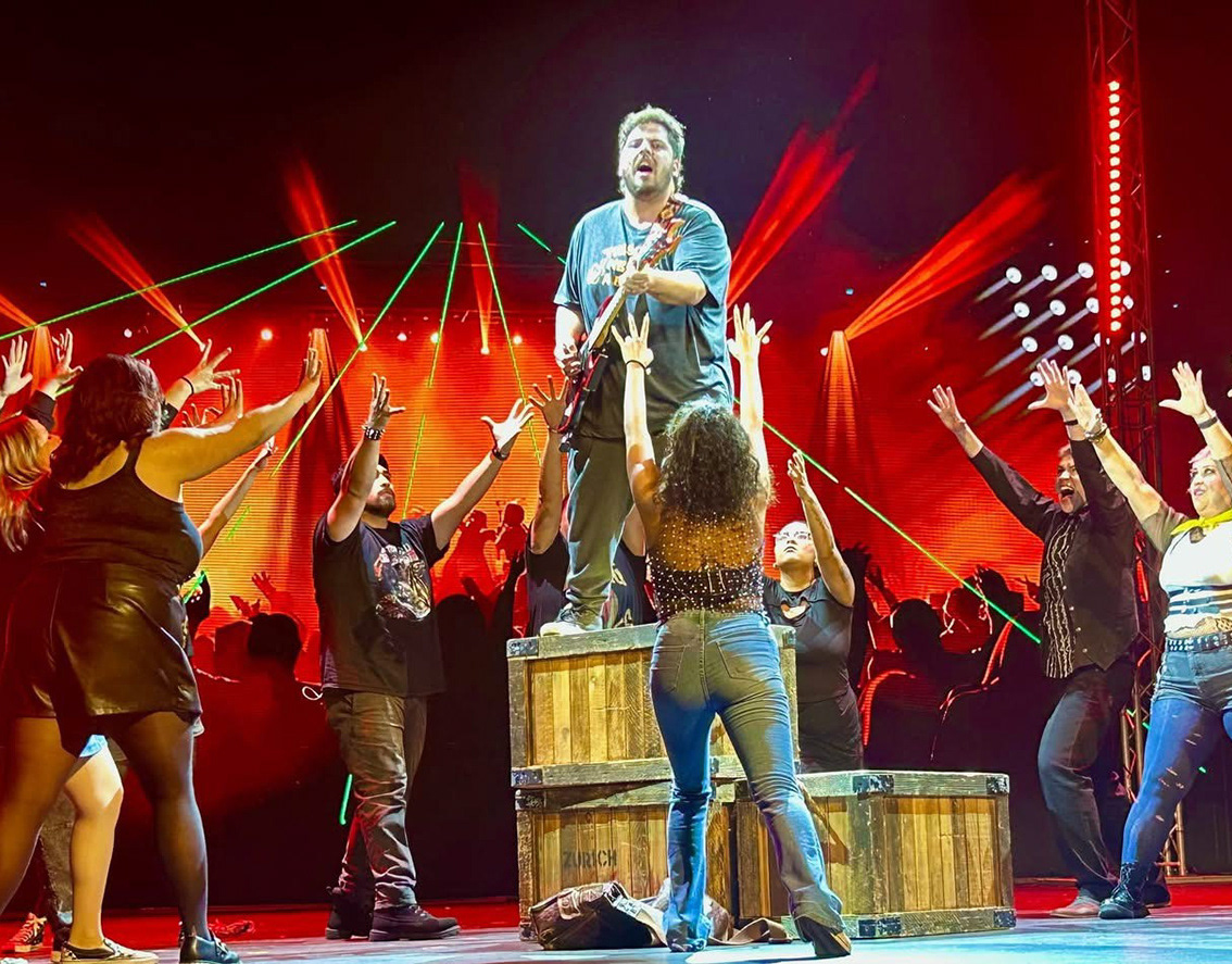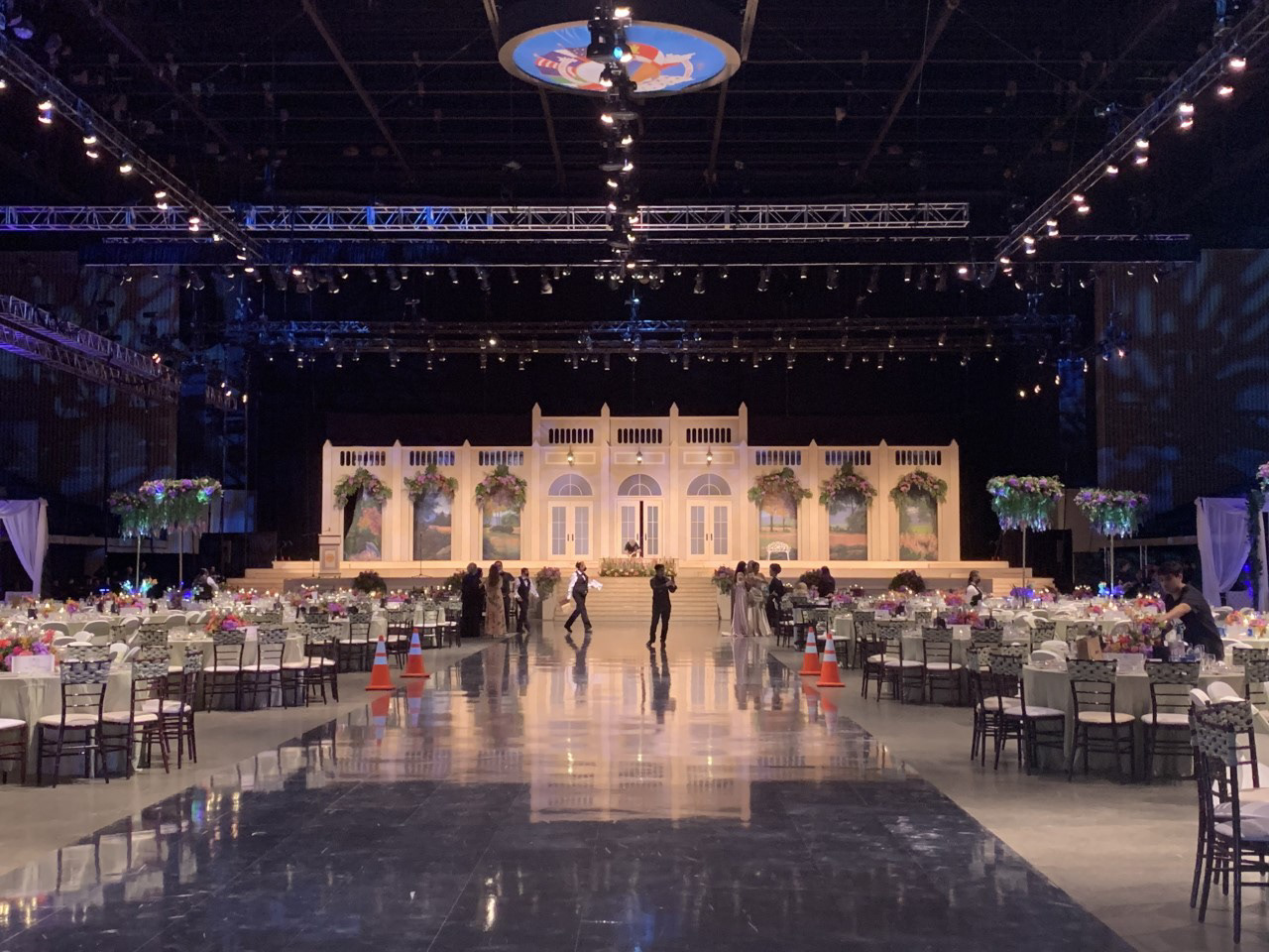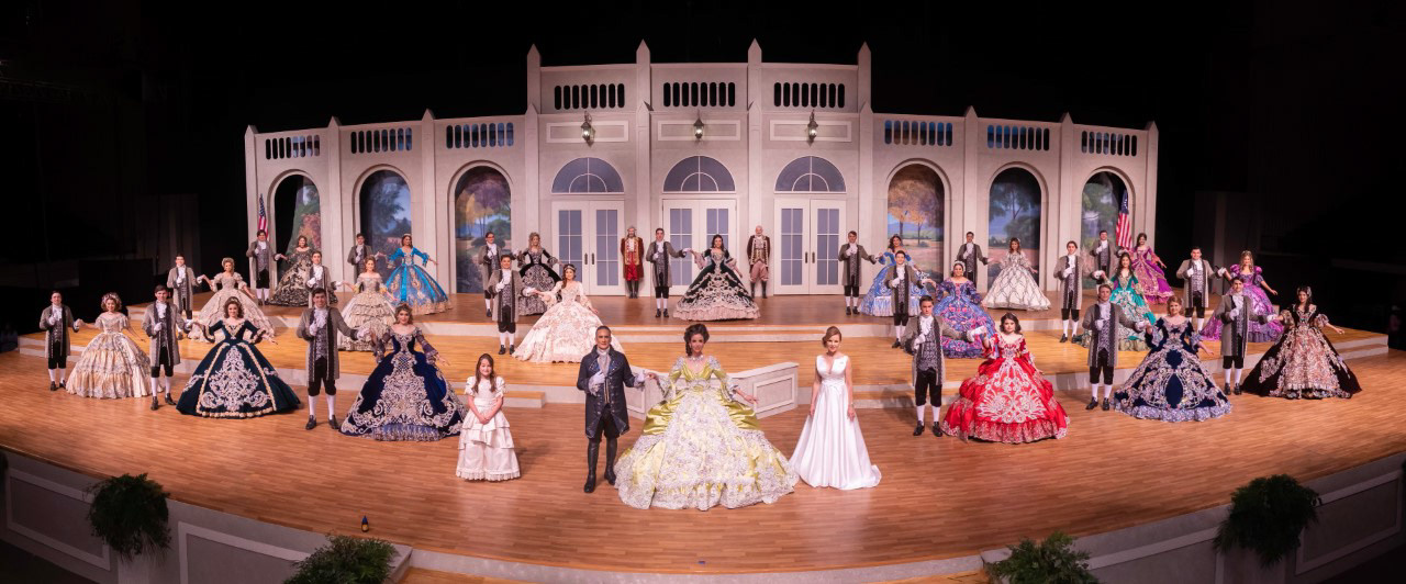 This Society of Martha Washington Colonial Ball set design evokes the feeling of stepping outdoors from a grand ballroom — a refined architectural façade framed by elegant archways and classic painted backdrops. The hand-rendered scenery beyond the arches captures serene landscapes that extend the space into a timeless vista, blending interior grace with open-air beauty. Soft light, symmetry, and craftsmanship come together to create a stage that feels both stately and romantic — a graceful continuation of tradition beneath the grandeur of Laredo’s most iconic celebration.